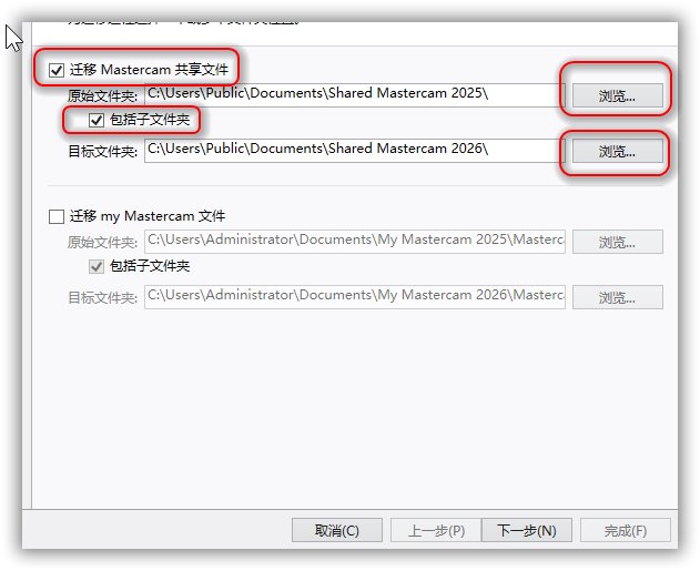 5、勾选“迁移Mastercam共享文件”和“包含子文件夹”,原始文件夹选择2025版本的共享文件,目标文件夹可以选择2026版本的默认共享文件夹位置,也可以另选一个文件夹,迁移完成之后再复制到默认位置即可。